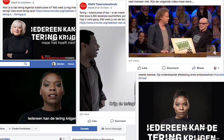 Hoe schud je mensen wakker? Door gebruik te maken van het feit dat de meeste mensen de ziekte alleen nog kennen als scheldwoord: tering. We hebben een serie korte filmpjes gemaakt waarin bekende en onbekende Nederlanders uitdagend de camera inkijken en zeggen: ‘Iedereen kan de tering krijgen.’ Gevolgd door de oplossing: ‘Maar het hoeft niet.’ Daarna vertellen we in tekst dat tering, of tuberculose, de meest dodelijke infectieziekte ter wereld is. En dat KNCV daar wat aan kan en wil doen.